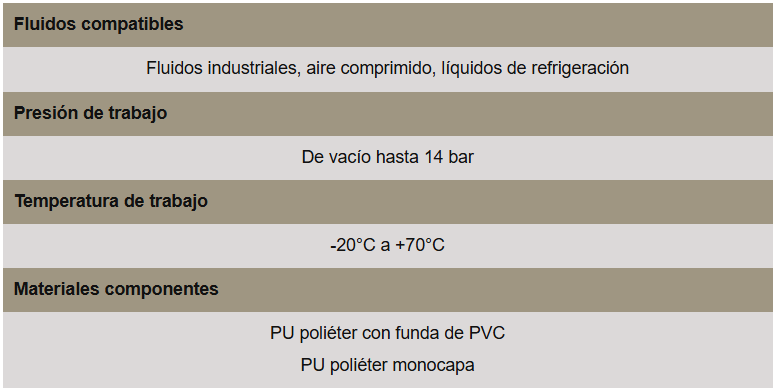 Esta gama, que combina la resistencia a las chispas con una excelente flexibilidad, está perfectamente adaptada a las aplicaciones de soldadura. Hay disponibles dos tipos de PU, poliéter (con funda de PVC) o poliéster monocapa que permiten una perfecta adecuación con los racores instantáneos Parker Legris.