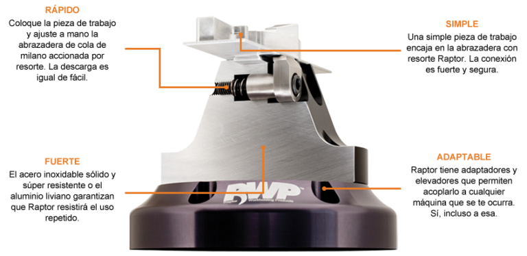 El diseño de cola de milano patentado de Raptor bloquea rápidamente la pieza en su lugar para lograr una rigidez y una resistencia de sujeción extremas.